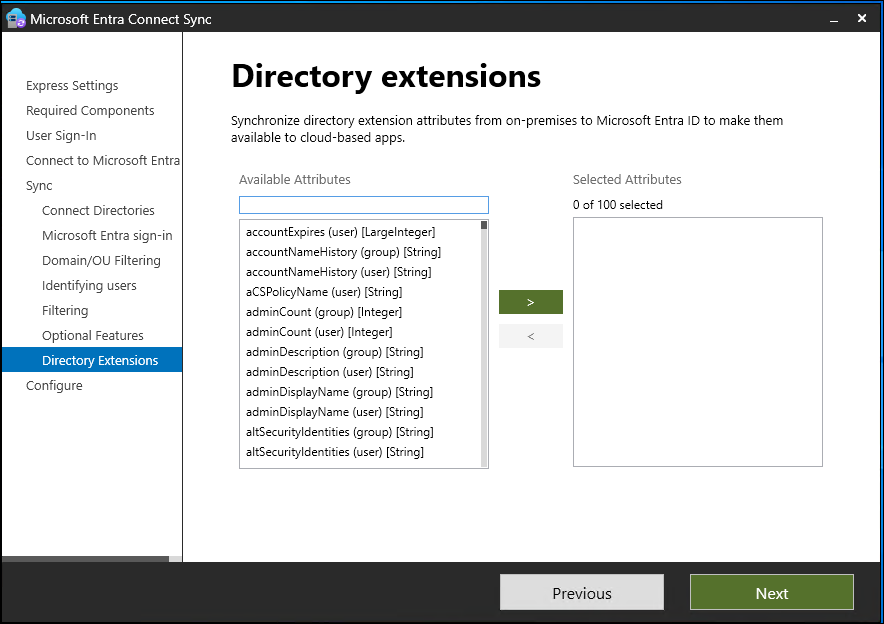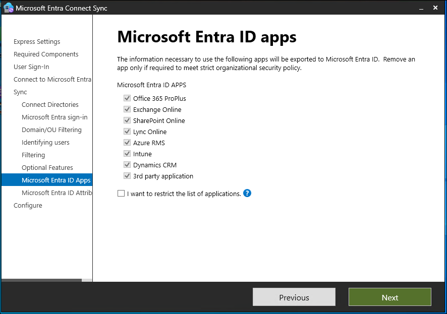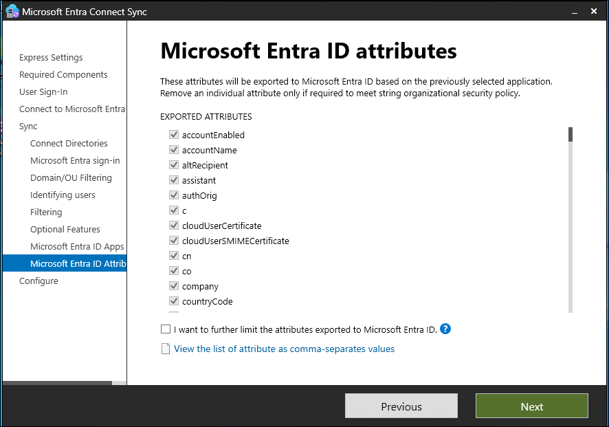 | Microsoft Entra app and attribute filtering | By enabling Microsoft Entra app and attribute filtering, you can tailor the set of synchronized attributes. This option adds two more configuration pages to the wizard. For more information, see Microsoft Entra app and attribute filtering. |