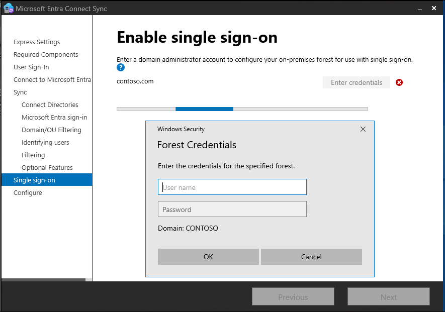 For each forest that has been added in Microsoft Entra Connect, you need to supply domain administrator credentials so that the computer account can be created in each forest. The credentials are used only to create the account. They aren't stored or used for any other operation. Add the credentials on the Enable single sign-on page, as the following image shows.