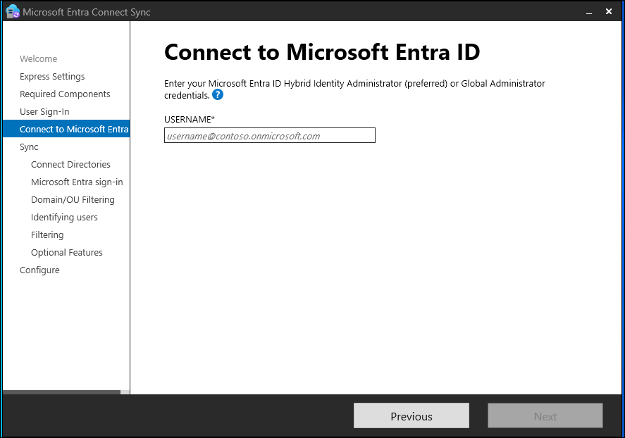 You might want to use an account in the default onmicrosoft.com domain, which comes with your Microsoft Entra tenant. This account is used only to create a service account in Microsoft Entra ID. It's not used after the installation finishes.