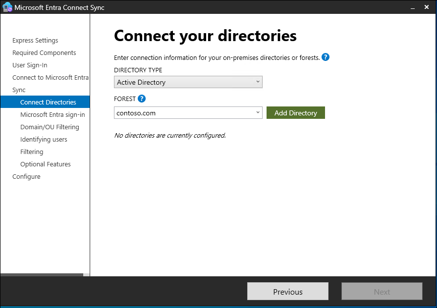 On this page, you can configure only a single domain in the initial installation. You can configure more domains later by running Microsoft Entra Connect again.