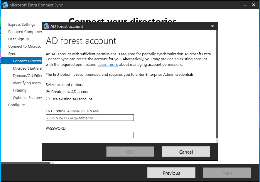 | Create new account | Create the AD DS account that Microsoft Entra Connect needs to connect to the Active Directory forest during directory synchronization. After you select this option, enter the username and password for an enterprise admin account. Microsoft Entra Connect uses the provided enterprise admin account to create the required AD DS account. You can enter the domain part in either NetBIOS format or FQDN format. That is, enter FABRIKAM\administrator or fabrikam.com\administrator. |