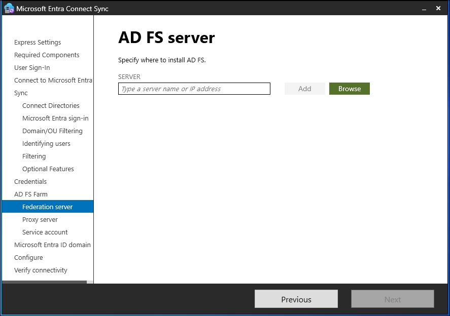 Microsoft recommends installing a single AD FS server for test and pilot deployments. After the initial configuration, you can add and deploy more servers to meet your scaling needs by running Microsoft Entra Connect again.