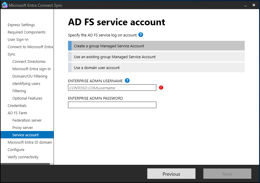 If you selected Create a group Managed Service Account and this feature has never been used in Active Directory, then enter your enterprise admin credentials. These credentials are used to initiate the key store and enable the feature in Active Directory.