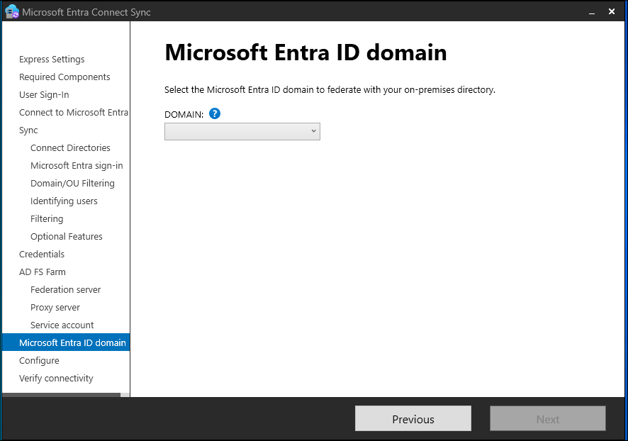 Use the Microsoft Entra Domain page to set up the federation relationship between AD FS and Microsoft Entra ID. Here, you configure AD FS to provide security tokens to Microsoft Entra ID. You also configure Microsoft Entra ID to trust the tokens from this AD FS instance.