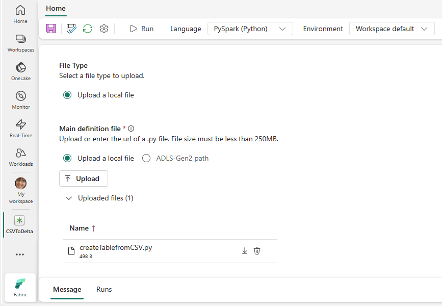 You can upload the main definition file from your local desktop, or you can upload from an existing Azure Data Lake Storage (ADLS) Gen2 by providing the full ABFSS path of the file. For example, abfss://your-storage-account-name.dfs.core.windows.net/your-file-path.