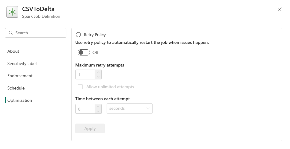 • Optimization: On the Optimization tab, you can enable and set up the Retry Policy for the job. When enabled, the job is retried if it fails. You can also set the maximum number of retries and the interval between retries. For each retry attempt, the job is restarted. Make sure the job is idempotent.
