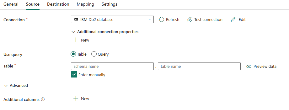 The following properties are supported for IBM Db2 database under the Source tab of a copy activity.