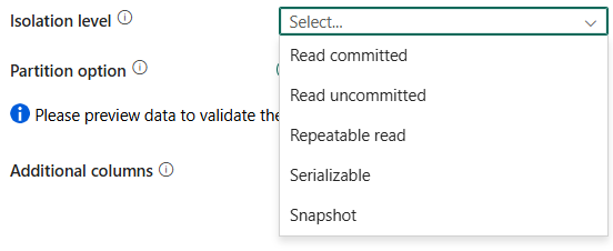 Isolation level: Specifies the transaction locking behavior for the SQL source. The allowed values are: Read committed, Read uncommitted, Repeatable read, Serializable, or Snapshot. Refer to IsolationLevel Enum for more details.