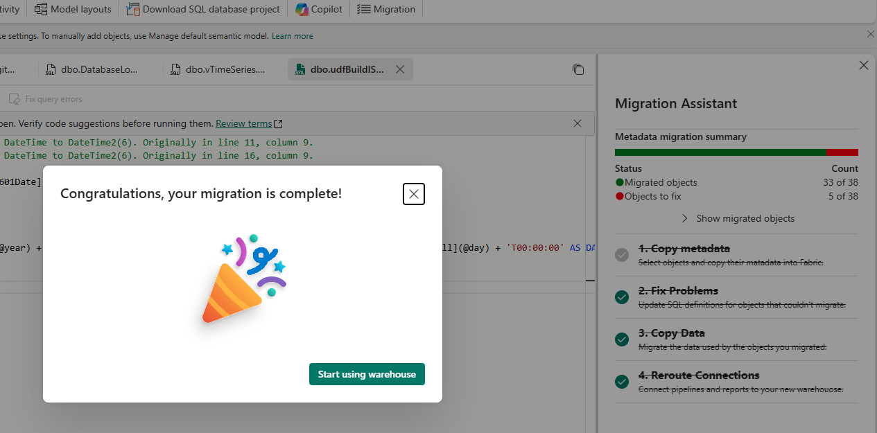 During this step, the Migration Assistant translates T-SQL metadata to supported T-SQL syntax in Fabric Data Warehouse. Once the metadata migration is complete, the Migration Assistant opens. You can access the Migration Assistant at any time by using the Migration button in the Home tab of the warehouse ribbon.