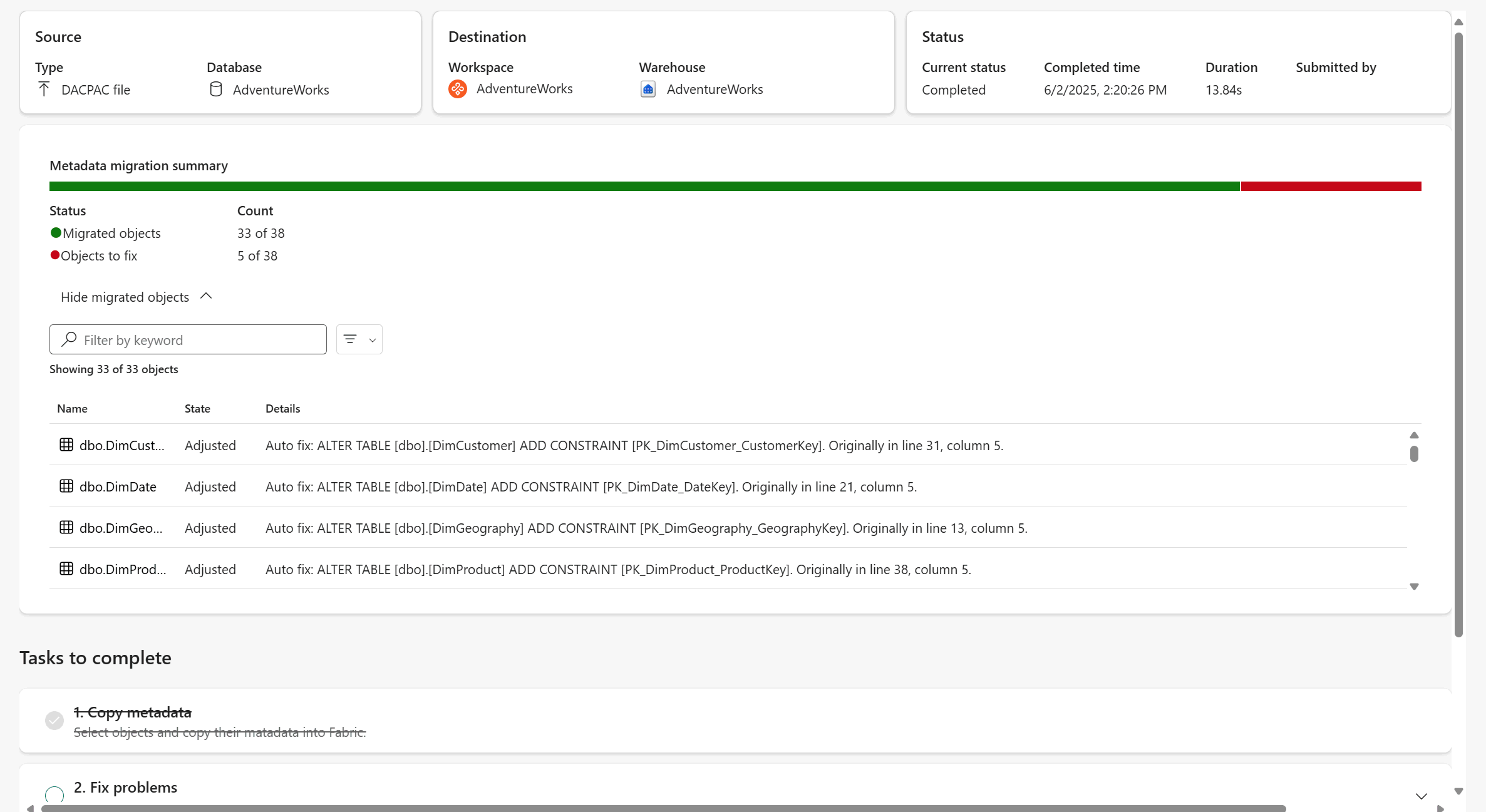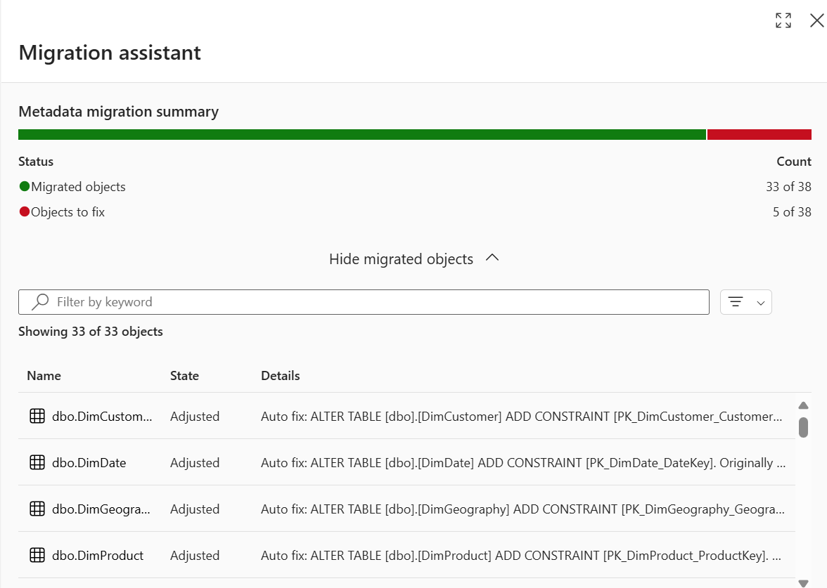 The State column indicates if the Migration Assistant adjusted the object's metadata during the translation to Fabric Data Warehouse. For example, you might see that certain column datatypes or T-SQL language constructs are automatically converted to the ones that are supported in Fabric. The Details column shows the information about the adjustments that the portal made to the objects.