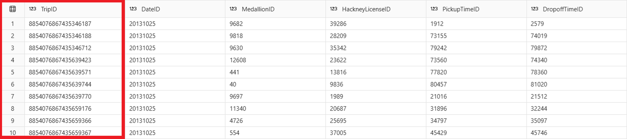 IDENTITYcolumn:CREATE TABLE dbo.Trip ( TripID BIGINT IDENTITY, DateID int, MedallionID int, HackneyLicenseID int, PickupTimeID int, DropoffTimeID int );Next, we use