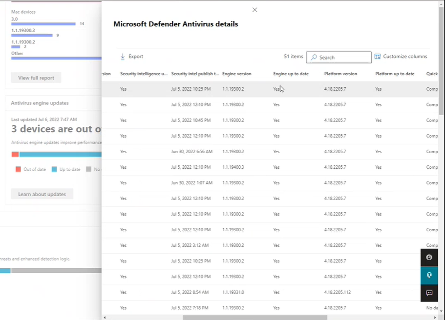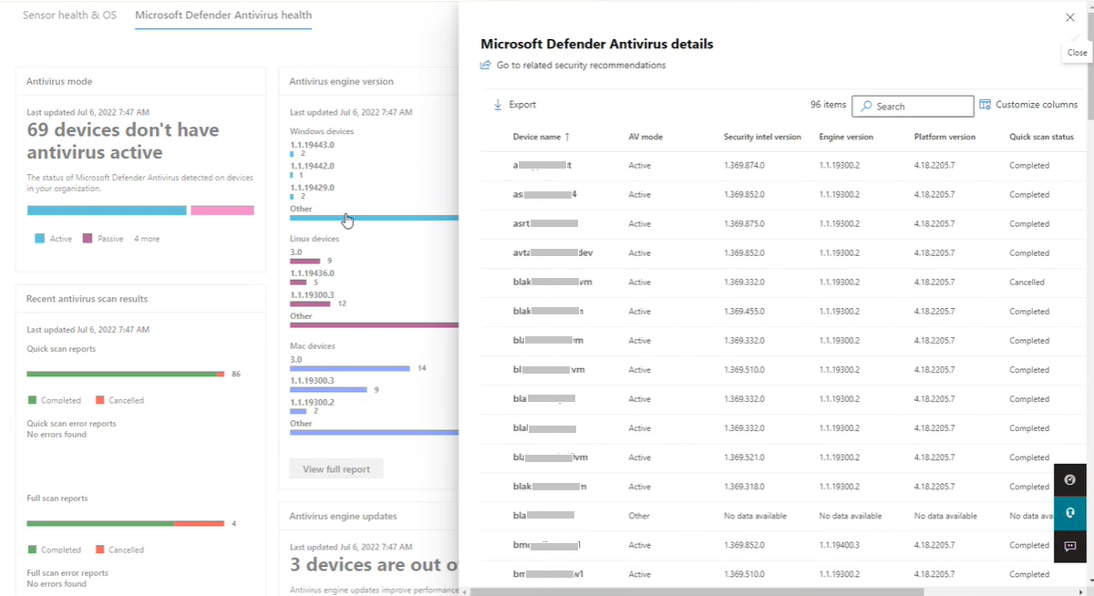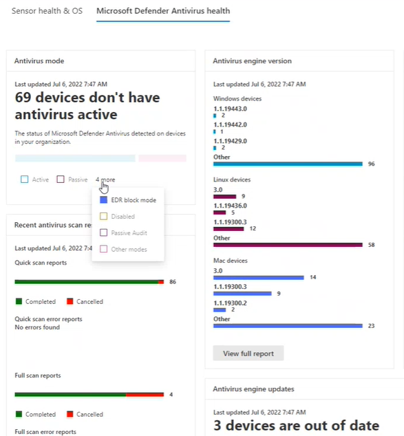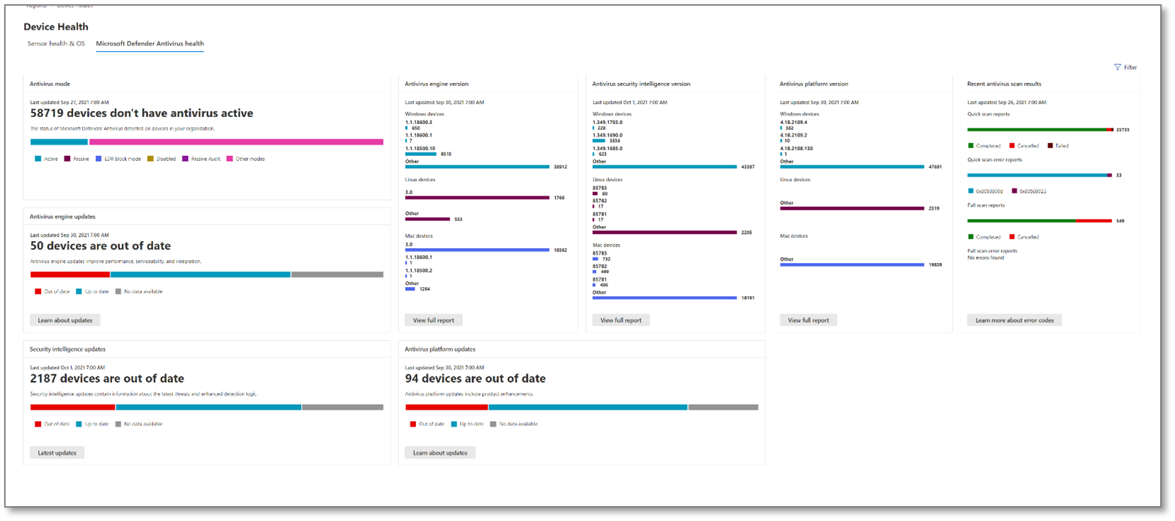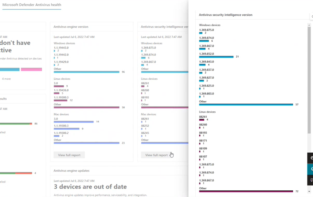 The Device Health report provides information about the devices in your organization. The report includes trending information showing the antivirus status and Microsoft Defender Antivirus engine, intelligence, and platform versions.