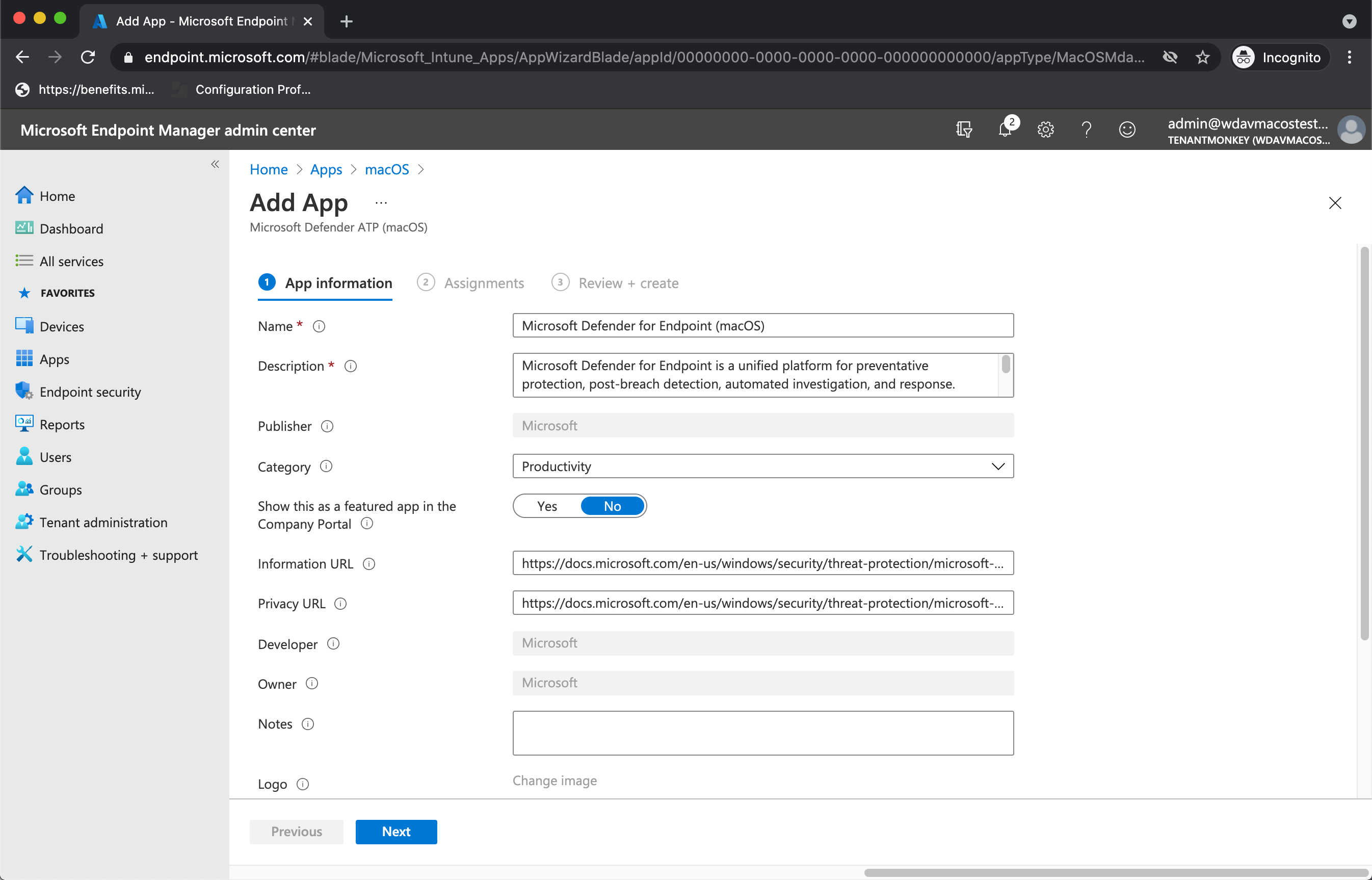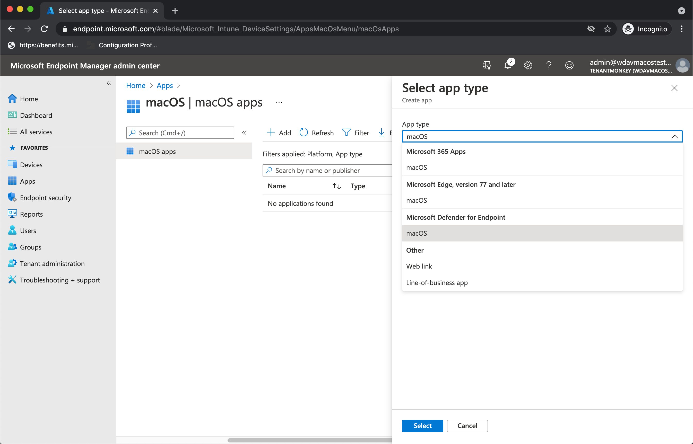 Under App type, select Microsoft Defender for Endpoint > macOS, then select Select.