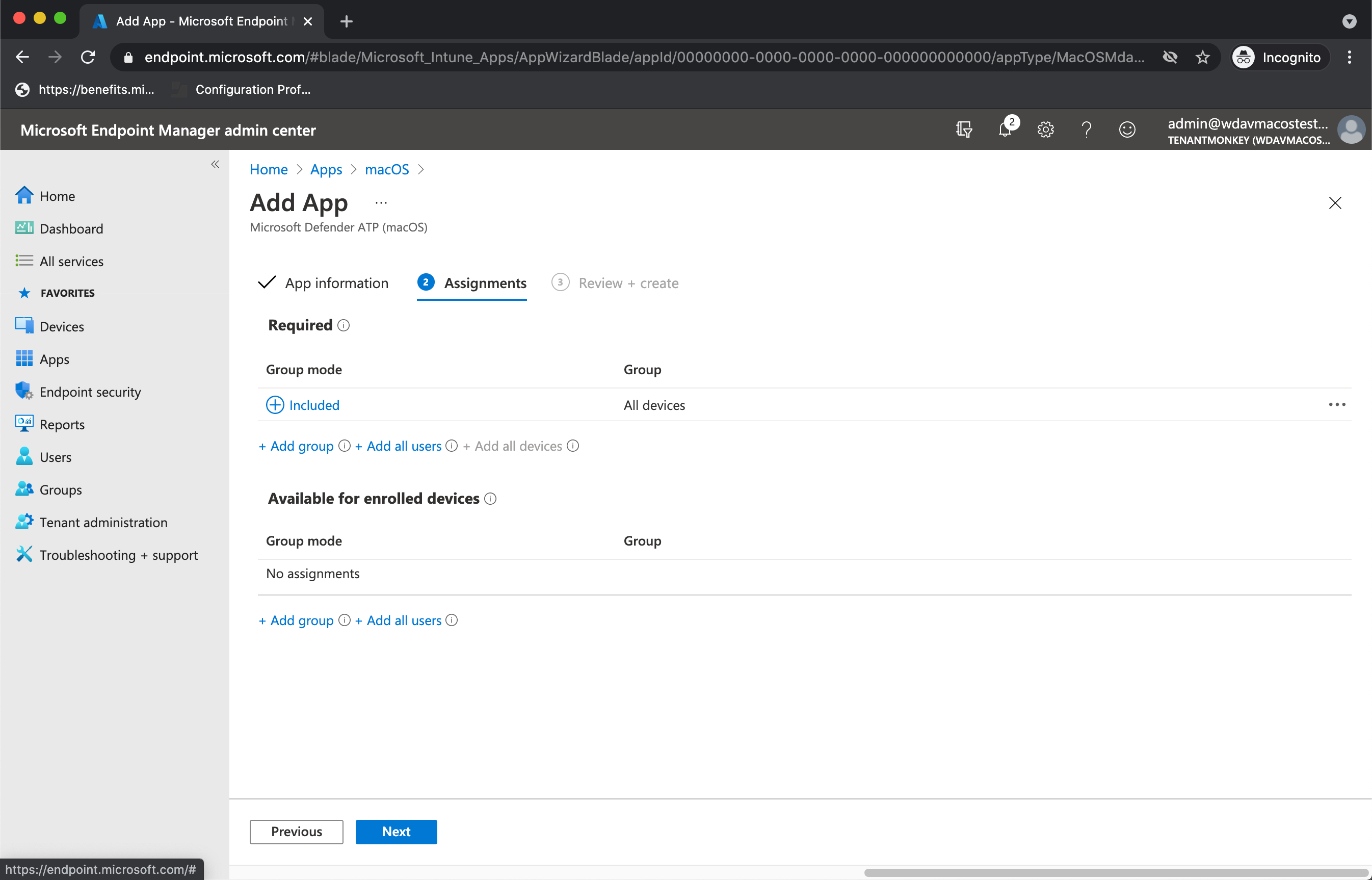 On the Assignments tab, assign the profile to a group where the macOS devices and/or users are located, then select Next.