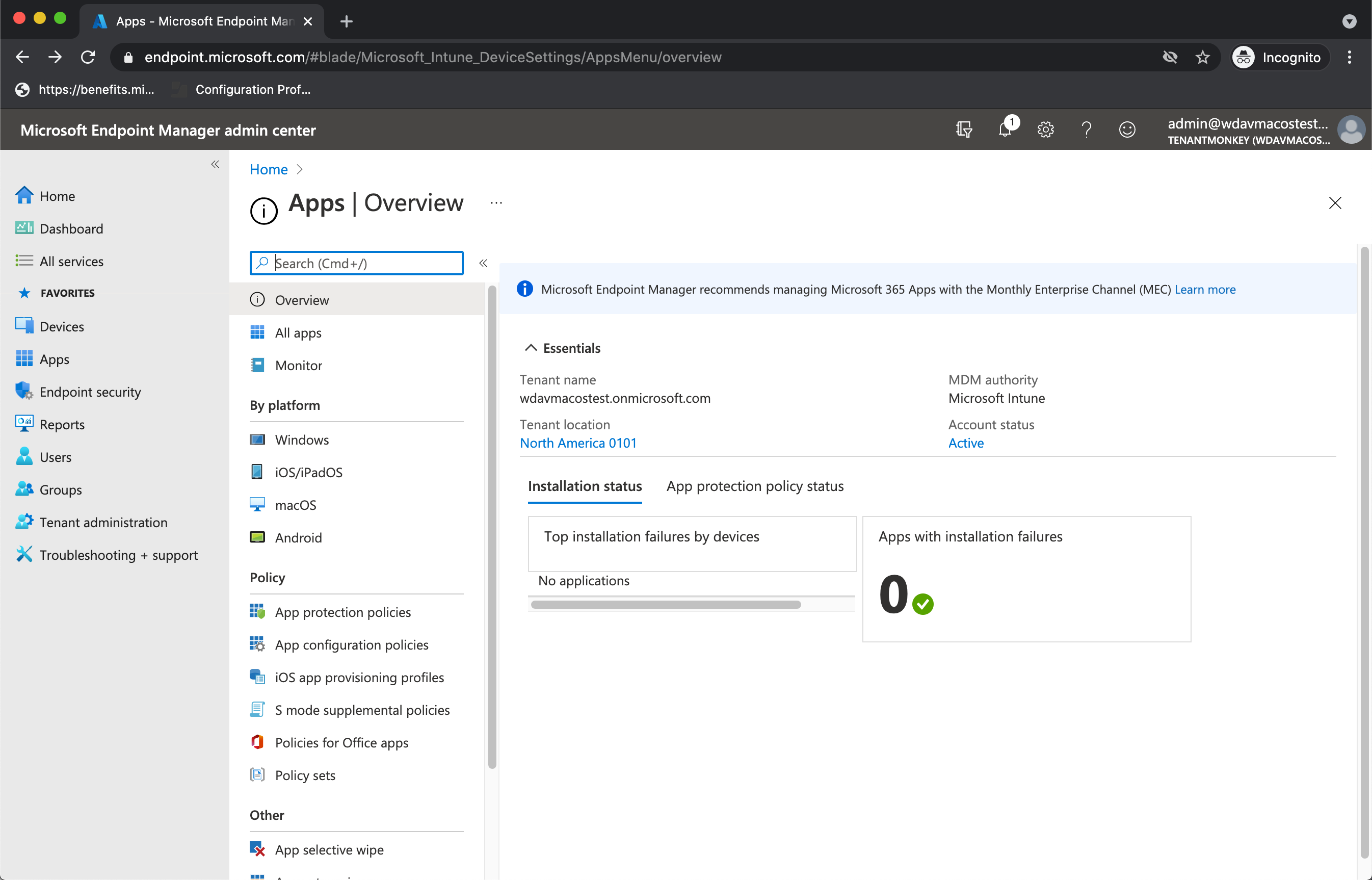 There are multiple ways to look at this information in the Microsoft Intune admin center, including monitoring and reports per device, user, configuration policies and more. Here's an example: