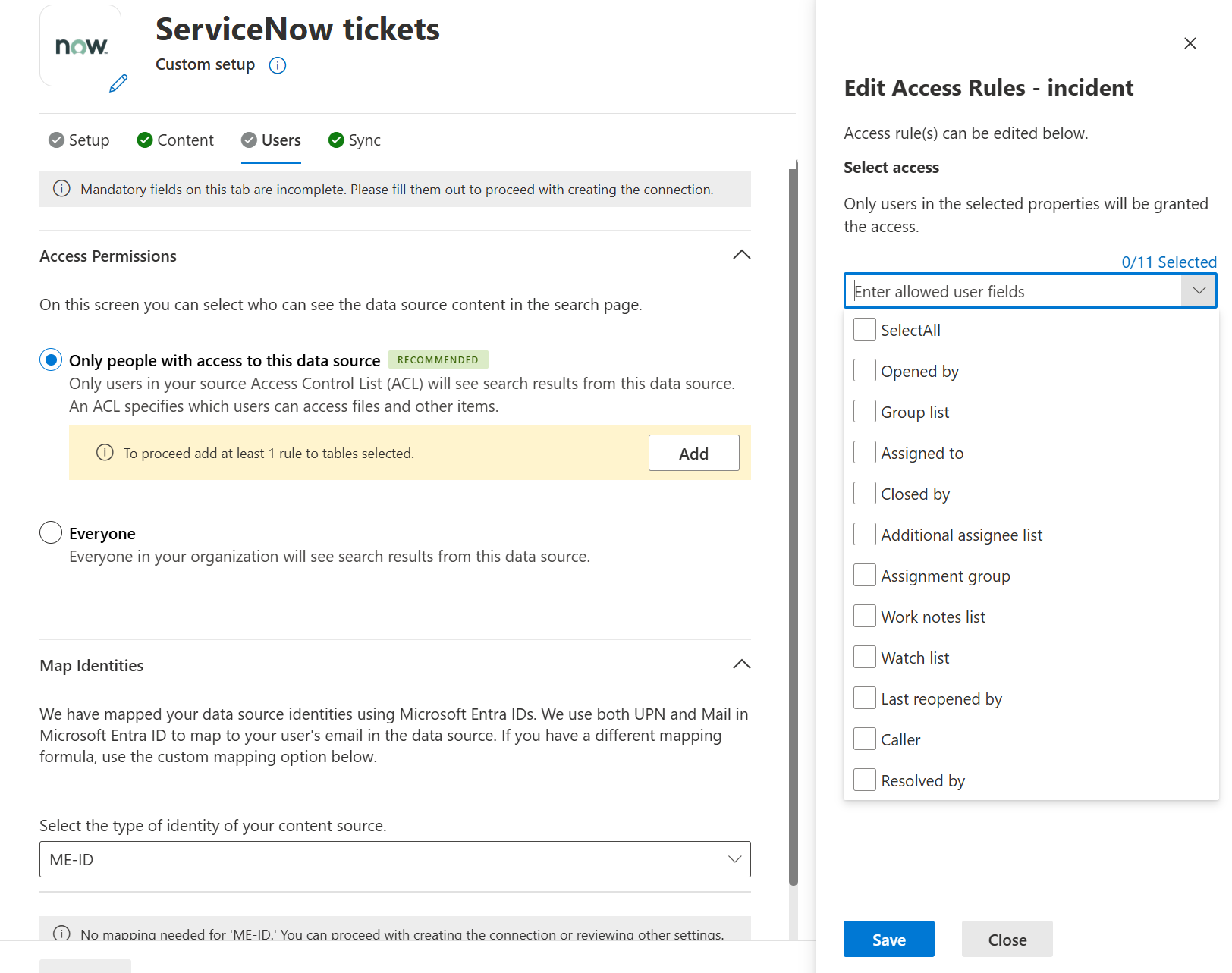 Service Account: For the connector setup, you need a service account to set up the connection to ServiceNow and to allow Microsoft Search and Microsoft 365 Copilot to periodically update the ticket details based on the refresh schedule.