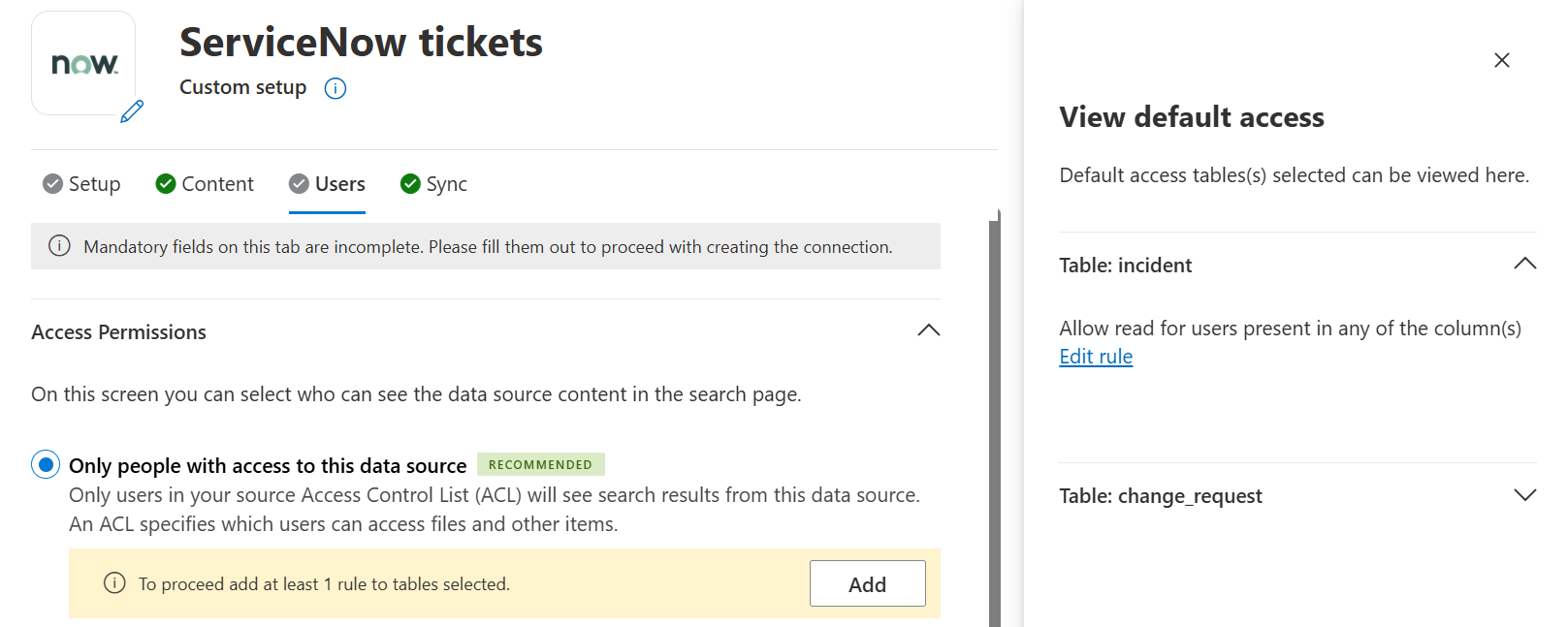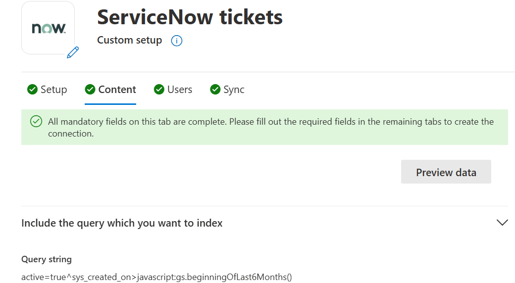 Add the ServiceNow Tickets Copilot connector The connector setup page that opens has 4 sections – Setup, Content, Users, and Sync. First, you need to provide the details for Setup & authorize the connection (covered in Steps 2 to Steps 4) before proceeding to configure the Content, Users & Sync (optional) & then finally create the connection.