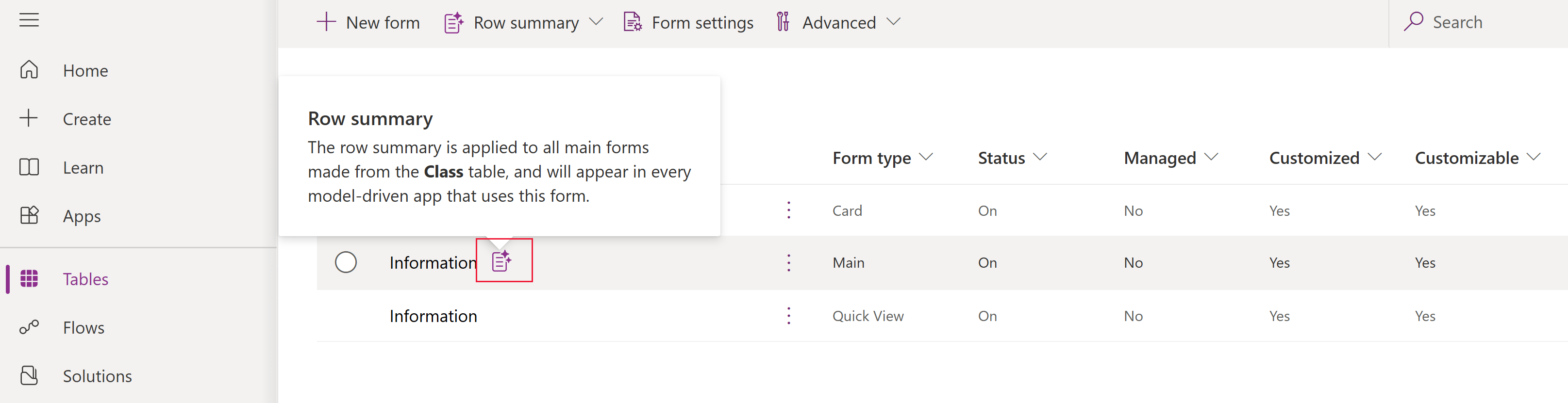 After you apply a row summary, the summary displays on all main forms for the table. To view the forms that include a row summary, in Power Apps, select Tables on the left navigation pane, and then under Data experiences select Forms.
