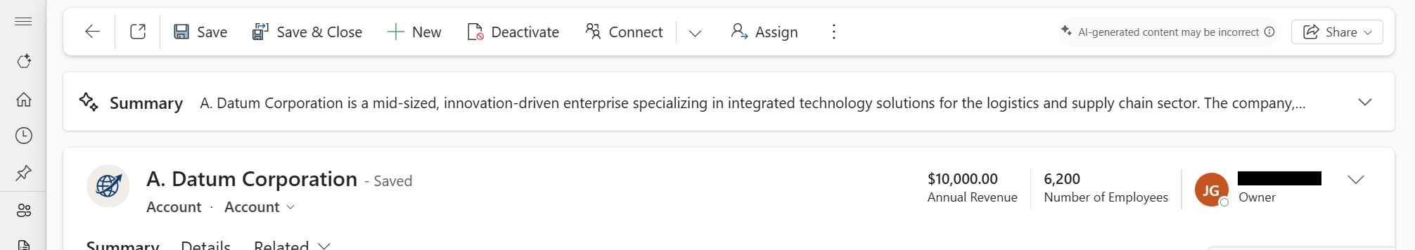 - Forms: When viewing a record in a main form, the summary appears in the insights bar at the top of the main form.