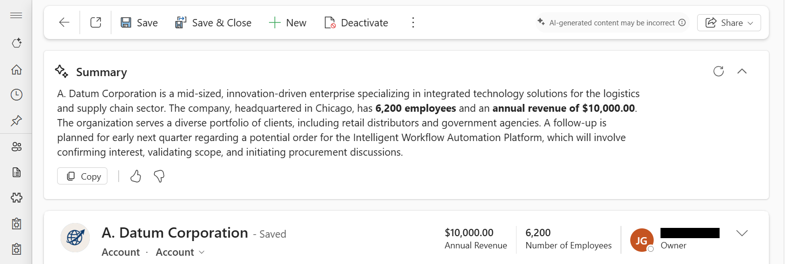 The Row summary feature in model-driven apps provides users with a concise, AI-generated overview of key details about a record. Summaries help users quickly understand essential information without manually scanning fields, related records, or activity timelines. You see summaries as a paragraph or bullet points, so they're easy to read.