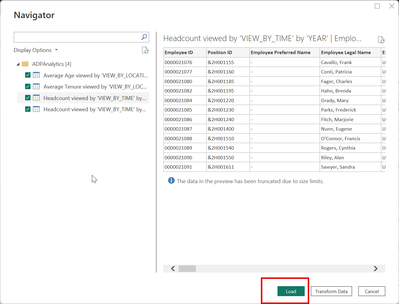You can Load the selected table, which brings the entire table into Power BI Desktop, or you can select Transform Data to edit the query, which opens the Power Query editor. You can then filter and refine the set of data you want to use, and then load that refined set of data into Power BI Desktop.