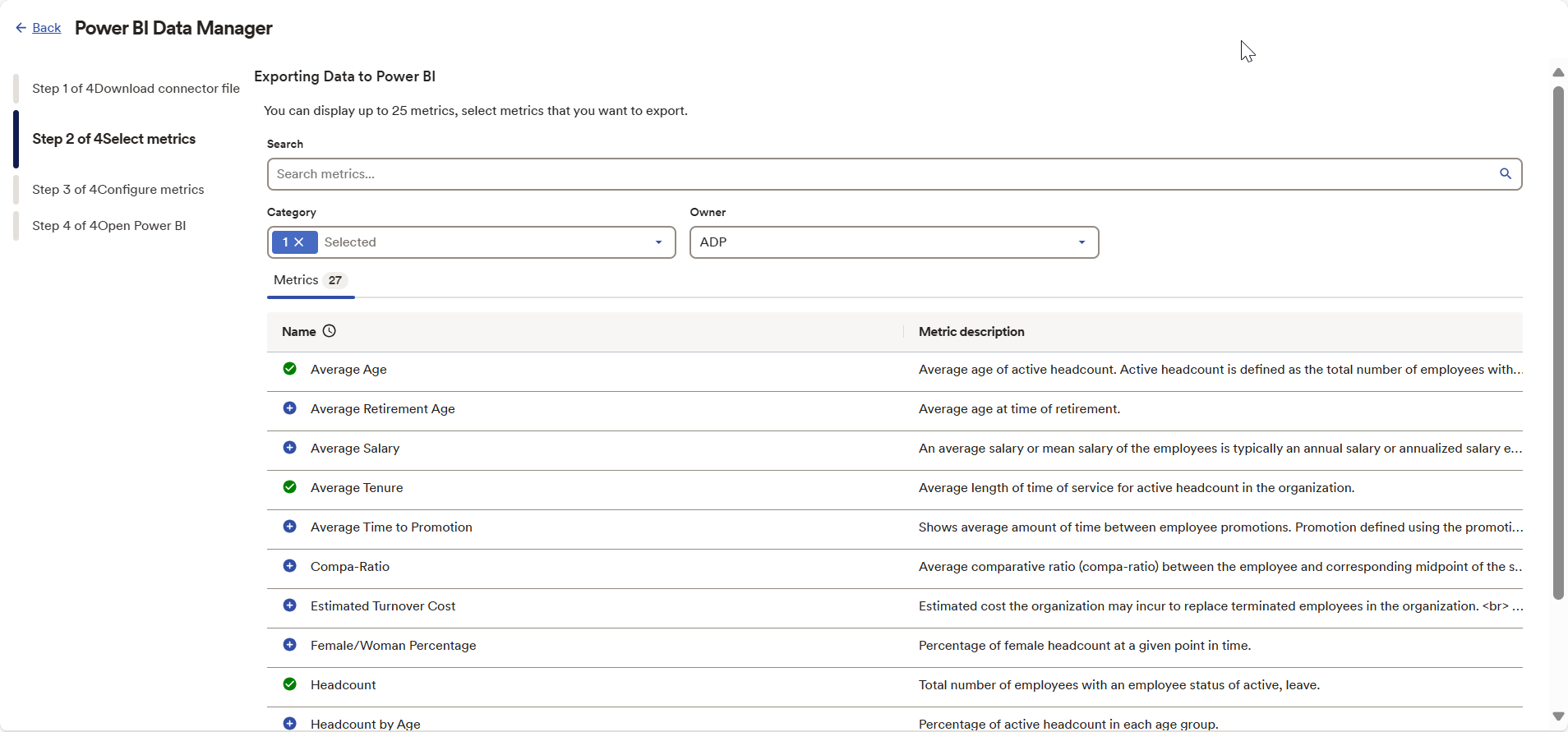 Select metrics to be imported into Power BI from the list of ADP Analytics metrics.