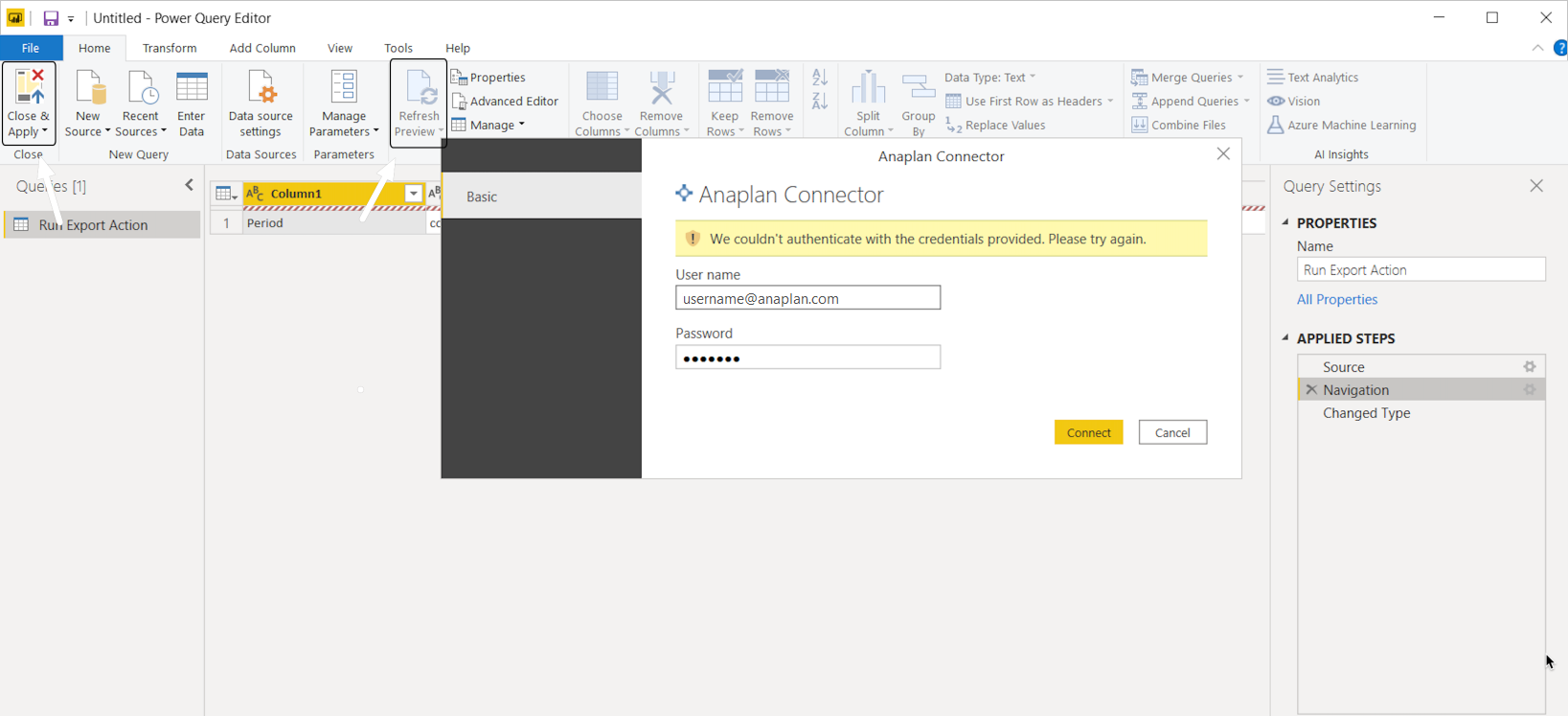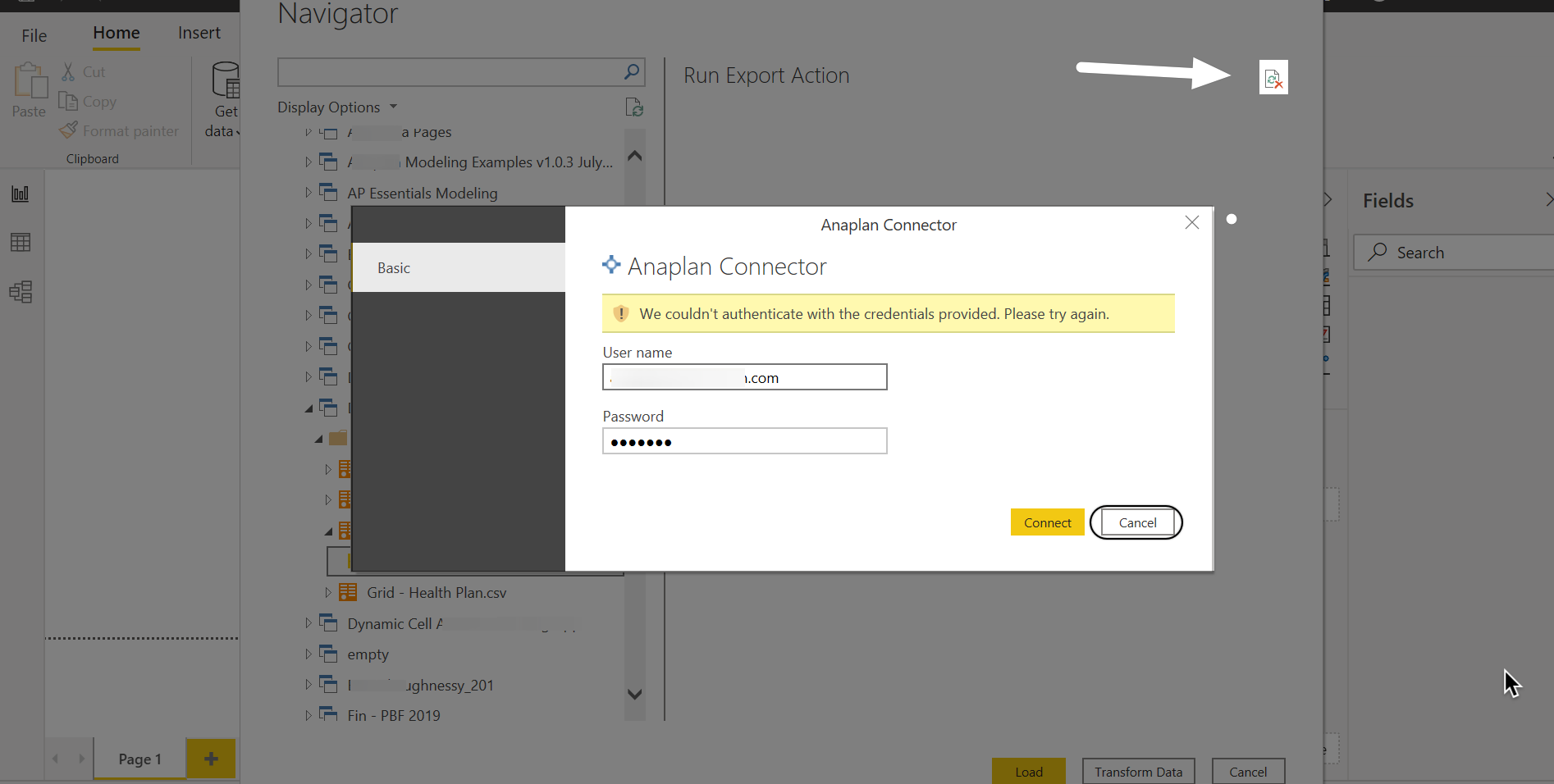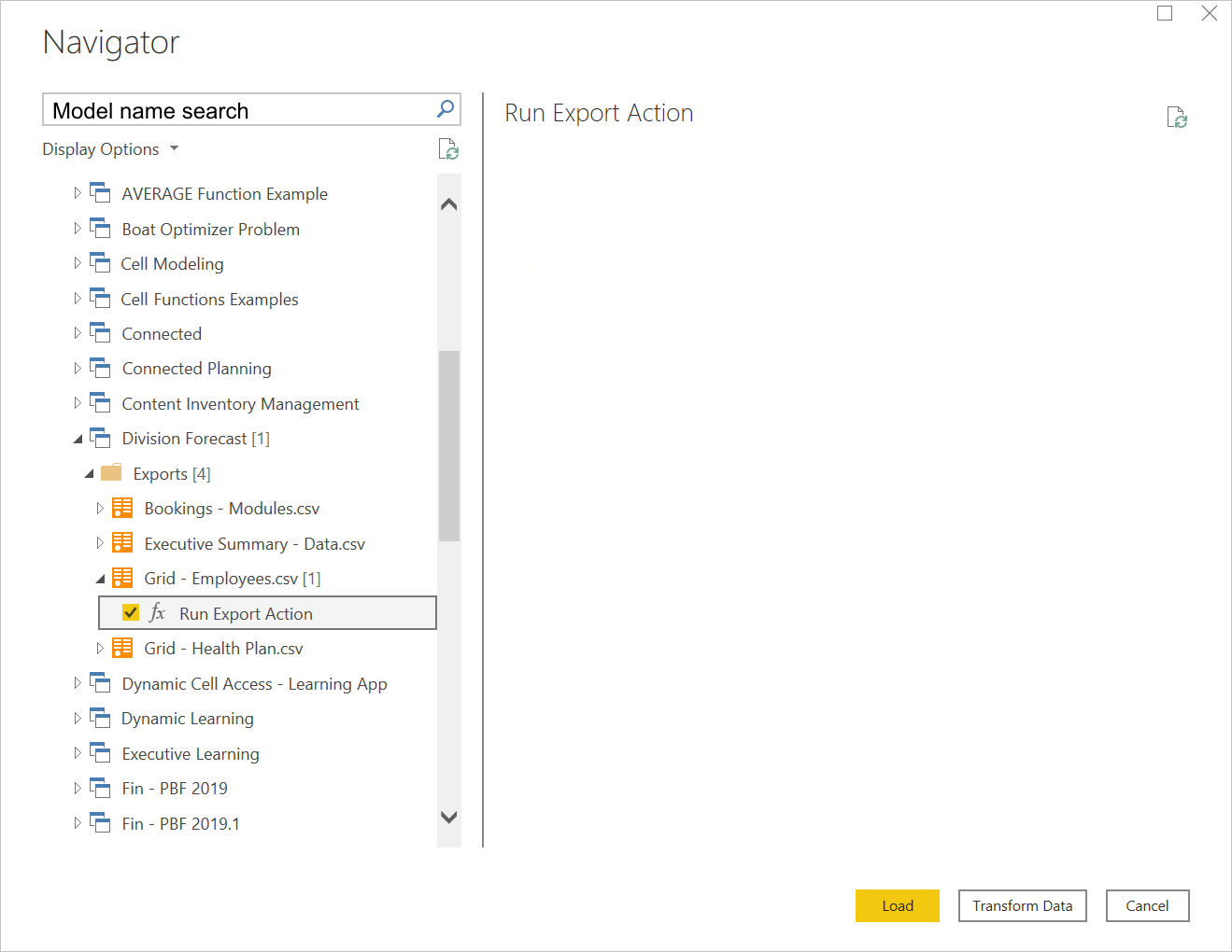 The Anaplan connector for Power BI uses exports to download data from your Anaplan model. Make sure you have an export action set. The navigator step is where you load and run these exports.