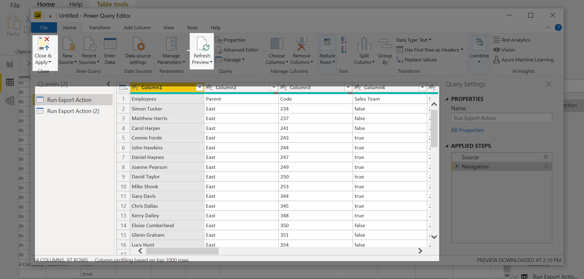 Connect to the export again. Your data then refreshes.