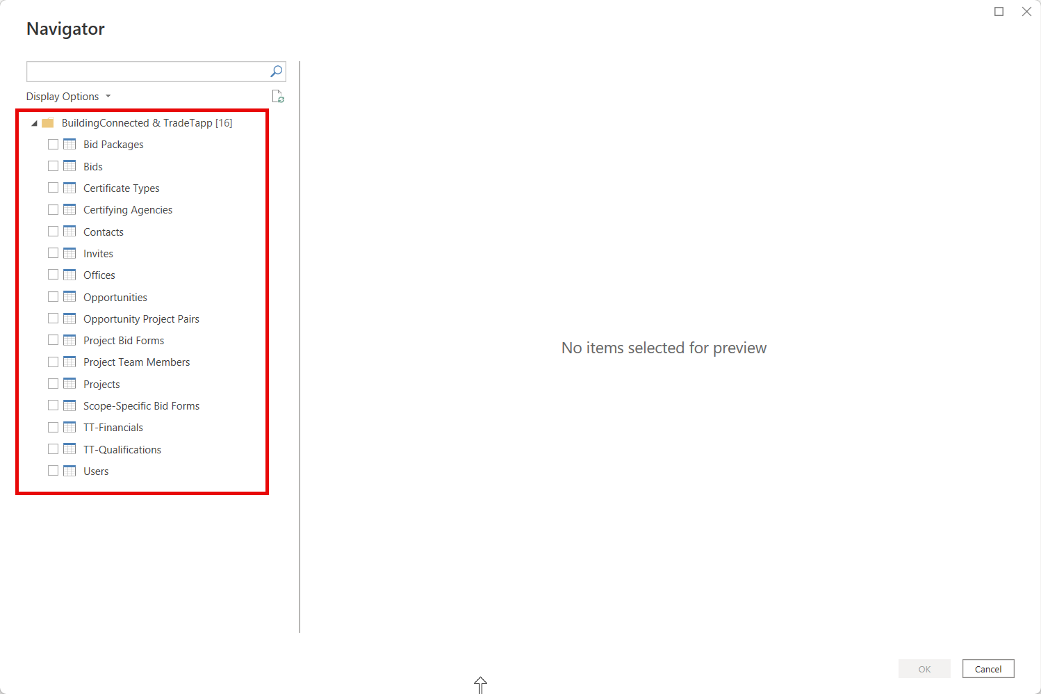 If you're getting data through the BuildingConnected & TradeTapp connector for the first time, a preview connector notice is displayed. Select Don't warn me again with this connector if you don't want this message to be displayed again, and then select Continue.