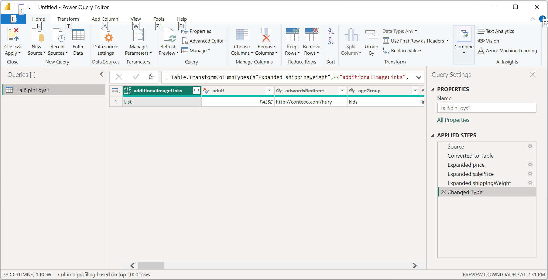 Loading the JSON file automatically launches the Power Query editor. Power Query uses automatic table detection to seamlessly flatten the JSON data into a table. From the editor, you can then continue to transform the data if you want, or you can just close and apply. More information: Automatic table detection from JSON files