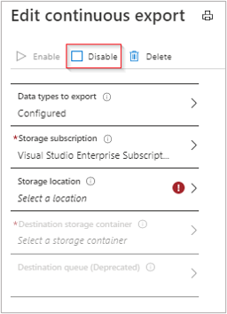 • Continuous export isn't compatible with workspace-based resources and must be disabled. After the migration is finished, you can use diagnostic settings to configure data archiving to a storage account or streaming to Azure Event Hubs.