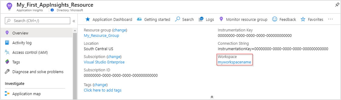 Within the Overview of an Application Insights resource, Classic Application Insights resources don't have a linked Workspace and the Classic Application Insights retirement warning banner appears. Workspace-based resources have a linked workspace within the overview section