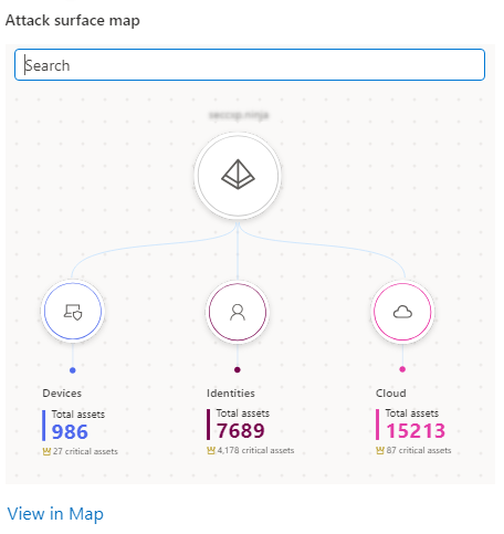 The Attack surface map displays your tenant's total and critical device, identity, and cloud assets.