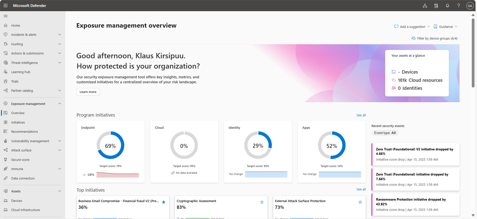 On the Exposure Management > Overview dashboard, you can review the overall state of your organizational security exposure.