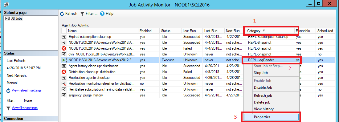 Sort by Category and identify the Log Reader Agent by the REPL-LogReader category.