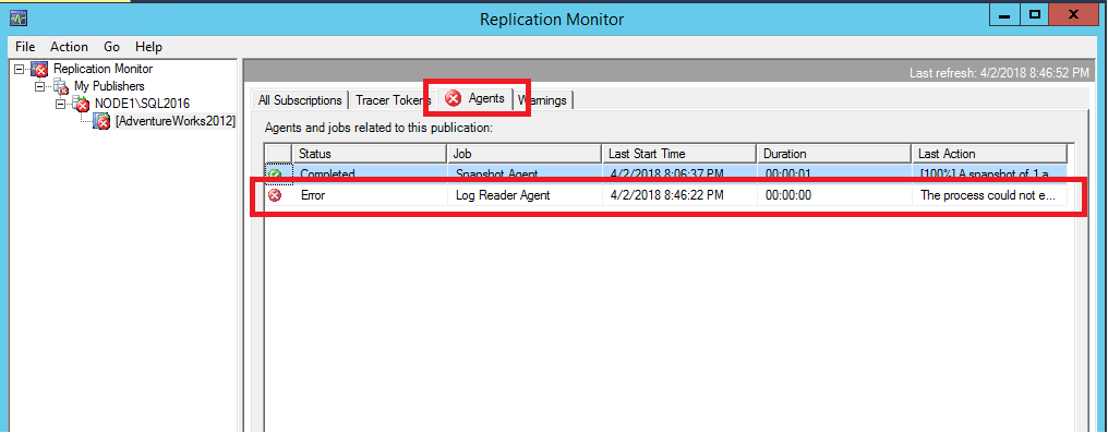 Select the AdvWorksProductTrans publication on the left, and then look for the red X on one of the tabs to identify where the issue is. In this case, the red X is on the Agents tab, so one of the agents is encountering an error: