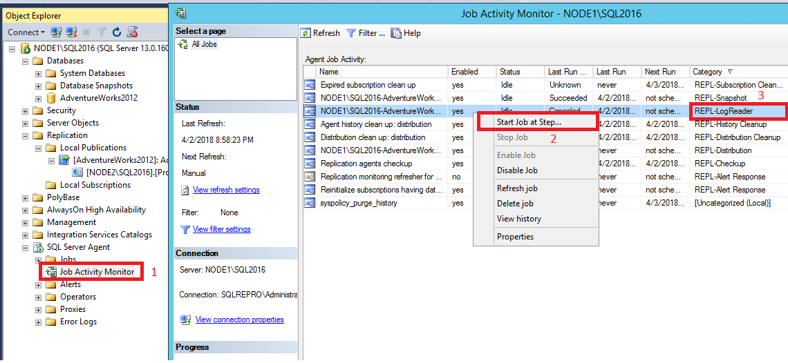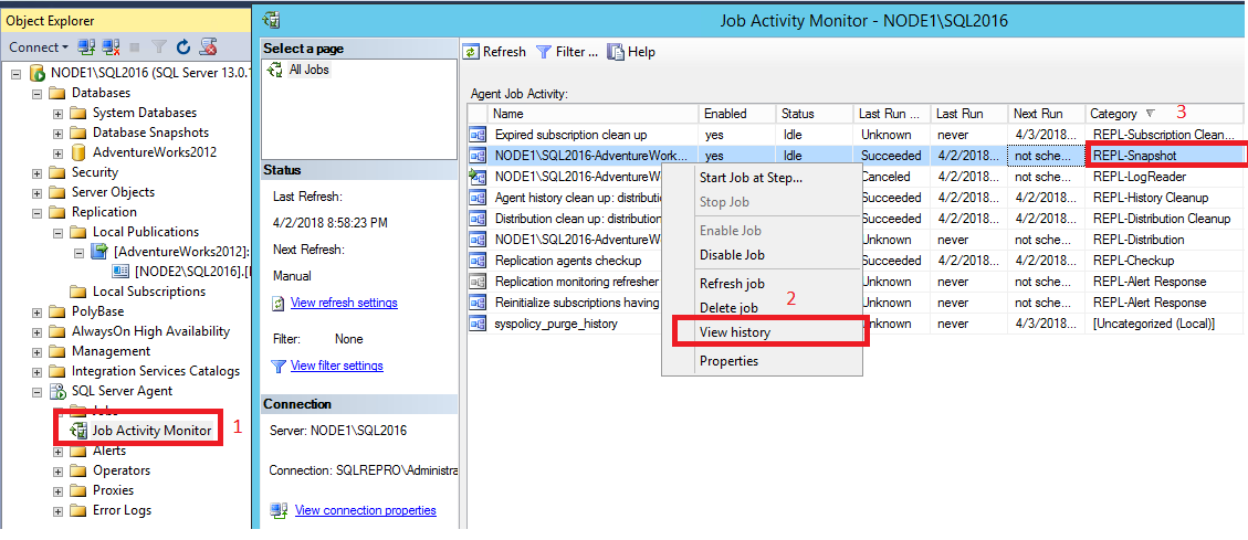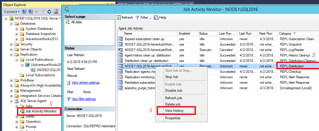 Error messages: Agent 'NODE1\SQL2016-AdventureWorks2022-AdvWorksProductTrans-NODE2\SQL2016-7' is retrying after an error. 89 retries attempted. See agent job history in the Jobs folder for more details.The error indicates that the Distribution Agent is retrying. To find more information, check the job history for the Distribution Agent: