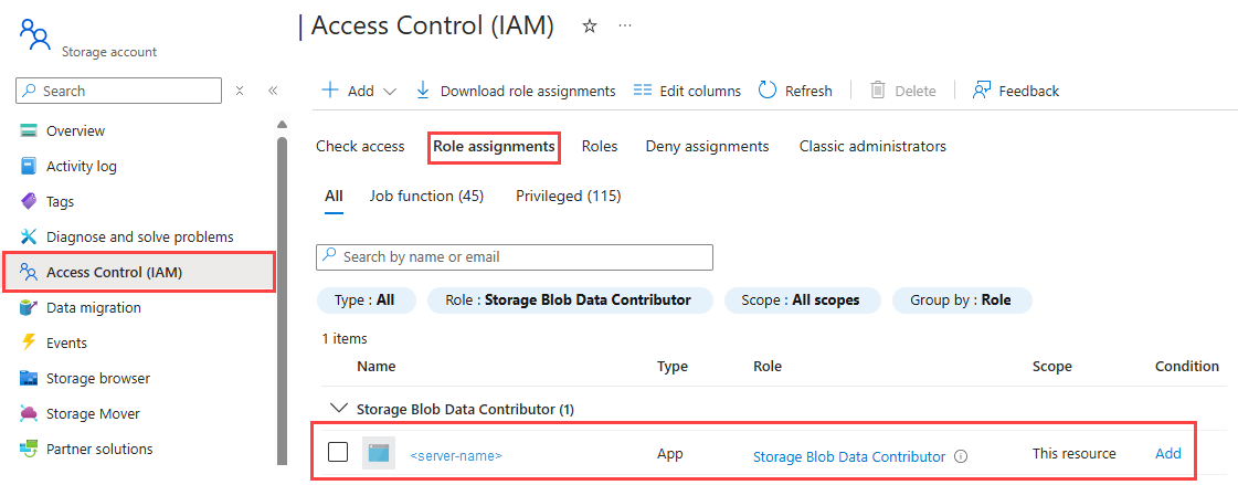 4. Filter by the Storage Blob Data Contributor role and verify that you see the managed identity for your SQL Server instance listed: