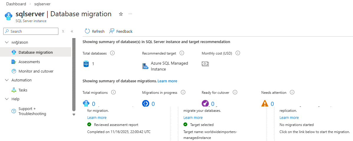 On the Database migration pane, you can migrate your SQL Server databases to Azure SQL Managed Instance. The migration process is fully managed and automated from the Azure portal. Once you're ready to start, you can use the tiles to assess your SQL Server databases, choose a migration target, and start the migration process.
