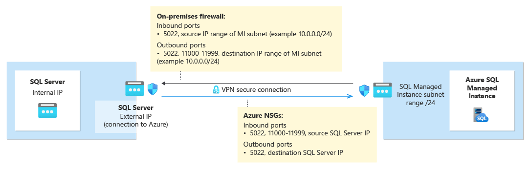 If you host your SQL Server instance outside Azure, you can establish a VPN connection between SQL Server and SQL Managed Instance by using either of these options: