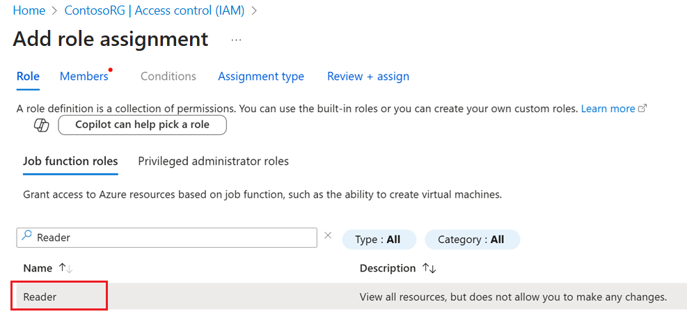 - Use + Add to select Add role assignment and open the Add role assignment pane.