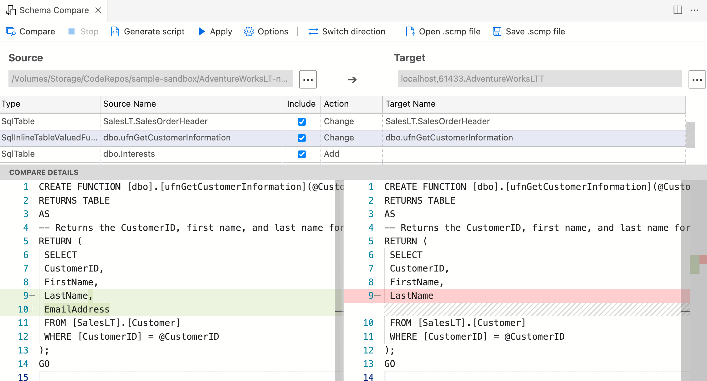 For more information about schema comparison and SQL projects, see the Schema comparison overview.