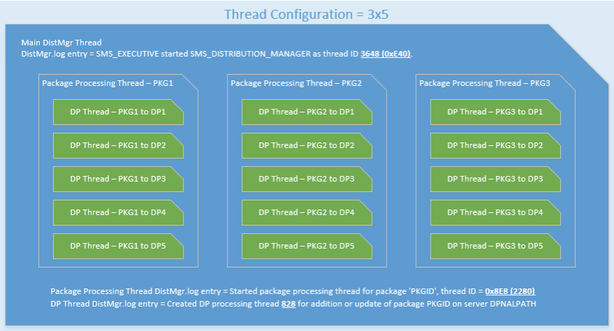 With the default thread configuration of 3x5, DistMgr can simultaneously process three packages and use up to five threads for each package, allowing it to use up to a total of 15 threads to perform work. Here's how this breaks down assuming we have more than three packages that need to get distributed to more than 5 DPs: