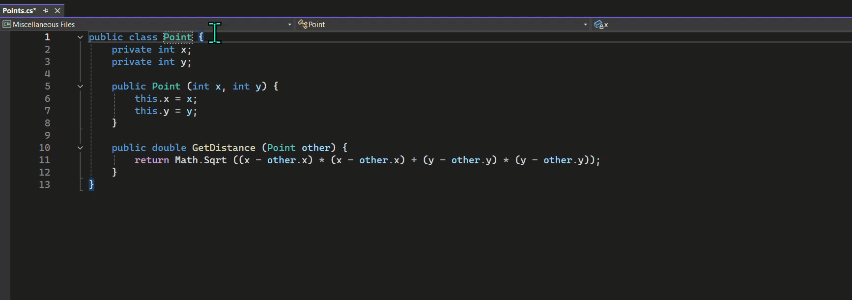 In the following example, after a change from Point to Point3D, an NES suggestion becomes available but doesn't appear immediately. The margin indicator and hint bar highlight a suggestion on line 4, which appears after selection of the indicator.