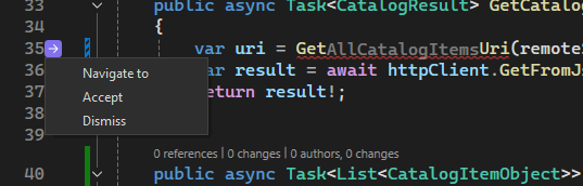 If an edit suggestion is below the current editor view, the arrow points down instead of right. Scroll past an edit suggestion, and the arrow hints the location of the next edit suggestion by pointing up or down, based on where you are in the file.