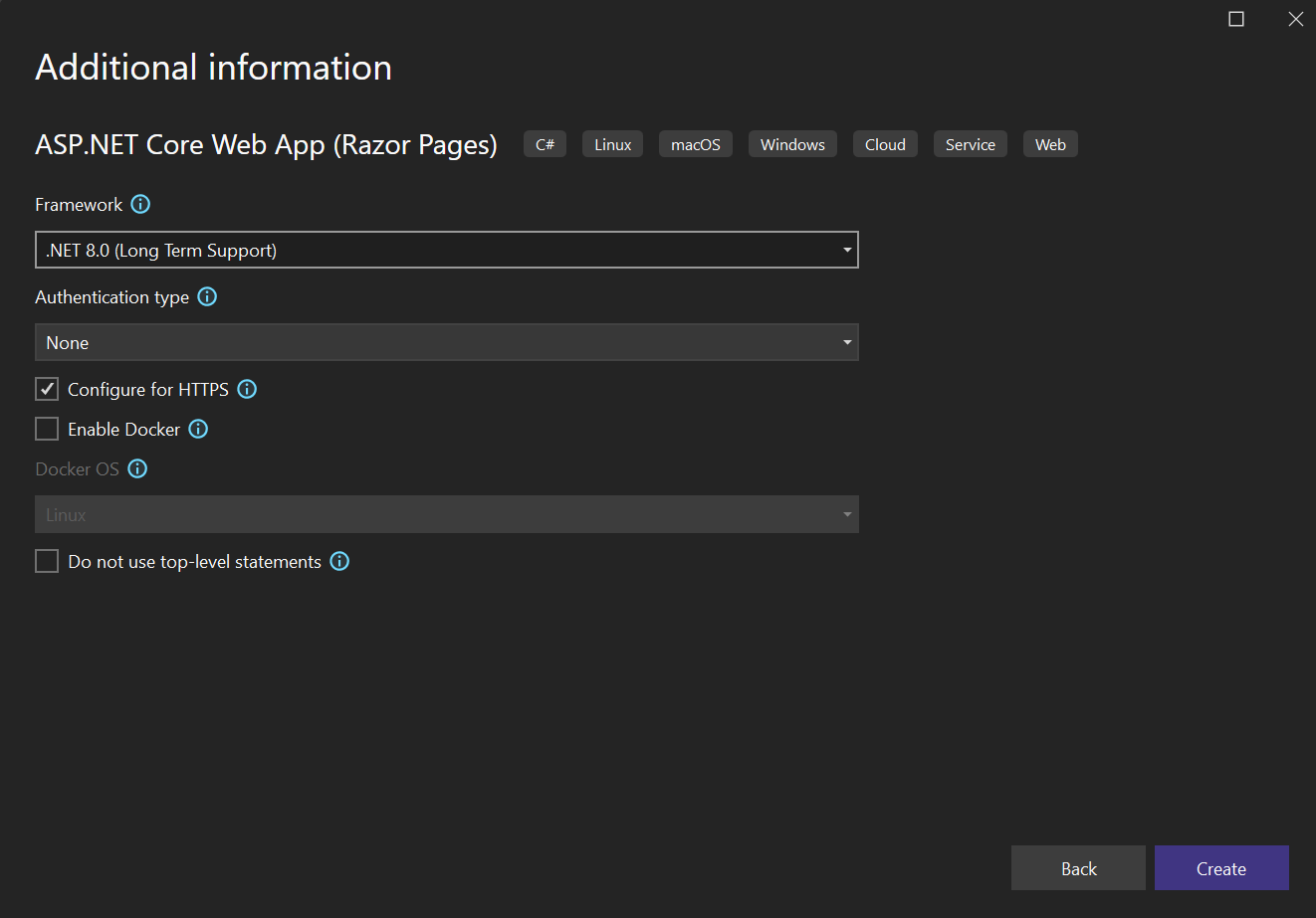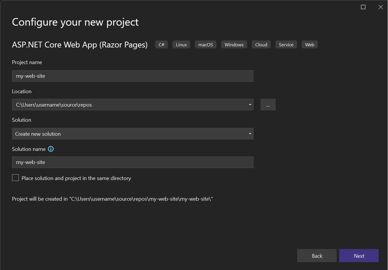 If you're not selecting from the recently used templates, you can filter all available project templates by Language (for example, C# or C++), Platform (for example, Windows or Azure), and Project type (for example, Desktop or Web). You can also enter search text into the search box to further filter the templates, for example, asp.net.