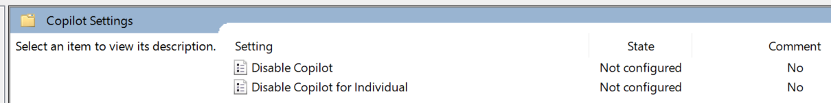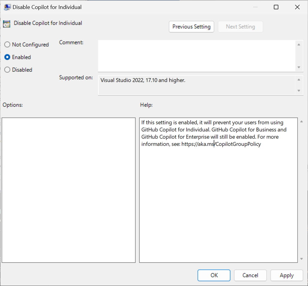 C:\Windows\PolicyDefinitions.Open the Windows Local Group Policy Editor and navigate to Computer Configuration > Administrative Templates > Visual Studio > Copilot Settings. Select a group policy.