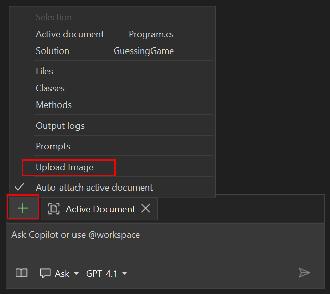 This feature can be handy when Copilot is helping you with UI development (for example, you attach an image of your design). The feature is also useful for debugging (for example, you attach a screenshot of the error).