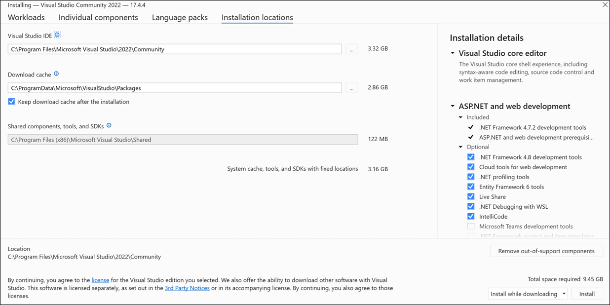 In the Shared components, tools, and SDKs section, installation uses the same drive that you chose in the Download cache section. The \Microsoft\VisualStudio\Shared directory is where Visual Studio stores the files that side-by-side Visual Studio installations share. SDKs and tools are also stored in this directory.