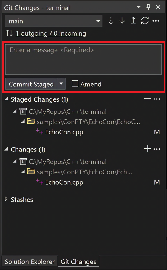After you prepare your commit by reviewing and staging the desired changes, you can create your commit by using the Git Changes window. Enter a commit message and select Commit Staged to complete the process: